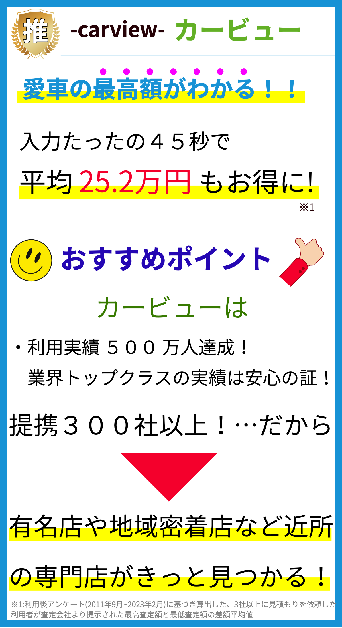 カービュー 約200社 大手提携が多い・サポート体制も安心 初心者や初めての一括査定利用者